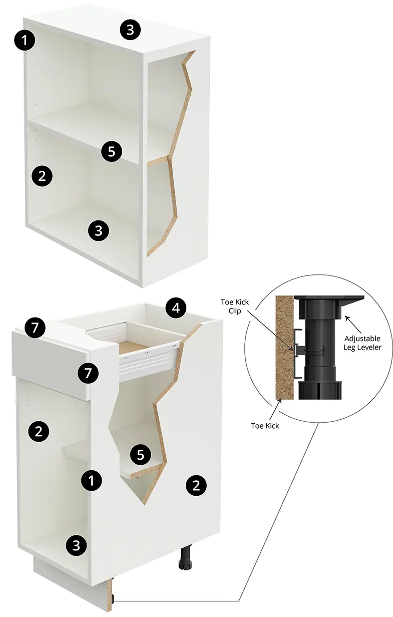 The drawer box is soft-close, 3/4 extension, single-wall steel construction. Integrated drawer slide and drawer side with white, baked-on, epoxy finish. 75 lbs. load capacity. Drawer bottoms are nominal 3/4” thick wood-based composite panel with two-sided TFL. White laminate on both faces & matching edgeband on top edge.
